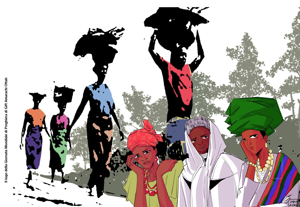 Nel logo della Giornata, raffigurato dalla giovane artista nigeriana, Gift Amarachi Ottah, in primo piano si vedono tre figure in abiti tradizionali che rappresentano le diverse culture etniche del territorio. In Nigeria si contano 250 gruppi etnici e 500 lingue diverse. I tre gruppi etnici più numerosi sono: gli Hausa-Fulani, che risiedono prevalentemente nella regione settentrionale e sono in gran maggioranza musulmani; gli Yoruba concentrati nella regione sud-occidentale e gli Igbo che occupano la parte sud-orientale e sono prevalentemente cristiani. Sullo sfondo del logo altre donne africane che “attraversano sentieri insidiosi per raggiungere le loro fattorie, spesso trasportando sia il raccolto che i loro figli: un bambino legato alla schiena, un carico pesante in equilibrio sulla testa”. Viene così rappresentata “la realtà quotidiana delle donne rurali nigeriane, la cui vita è segnata da un lavoro senza fine dall’alba al tramonto”.