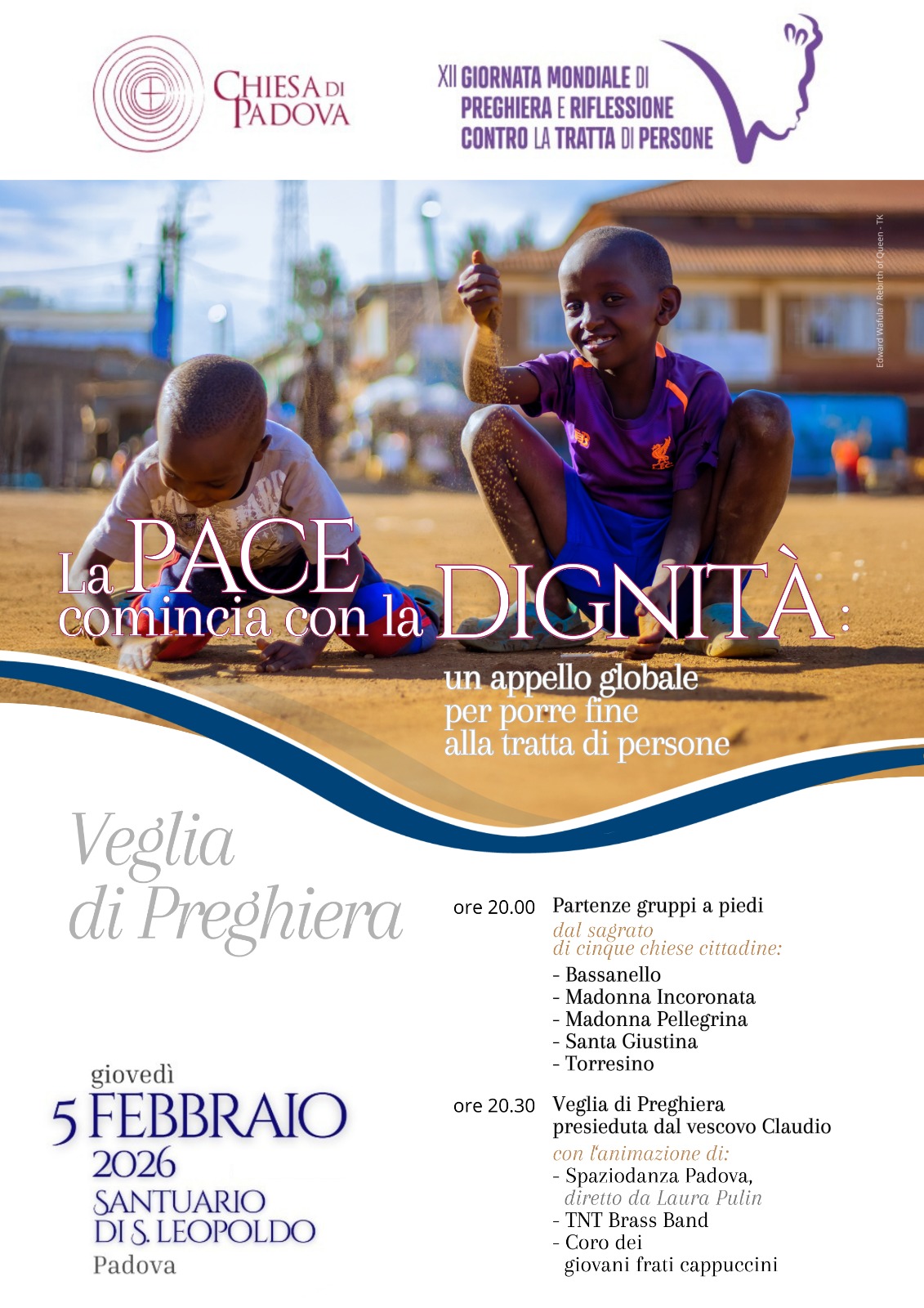 Anche a Padova celebreremo questa Giornata con il vescovo Claudio. Cinque gruppi di pellegrini partiranno alle ore 20.00 di giovedì 5 febbraio dal sagrato di cinque chiese cittadine – Madonna Incoronata, Madonna Pellegrina, Santa Giustina, Torresino, Bassanello – per raggiungere il santuario di San Leopoldo Mandic a Padova dove alle ore 20.30 inizierà la veglia di preghiera. Durante la celebrazione saranno date alcune testimonianze che raccontano questo fenomeno e la serata sarà arricchita da intermezzi musicali a cura di “TNT Brass Band” e da “Spaziodanza – Padova” con alcune coreografie che volutamente contrastano con la crudeltà del fenomeno per mostrare la possibilità di riscatto, leggerezza, armonia, libertà.